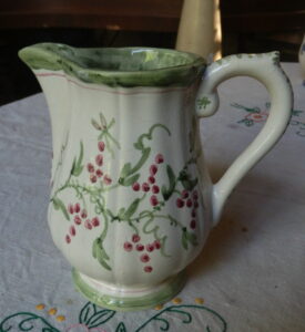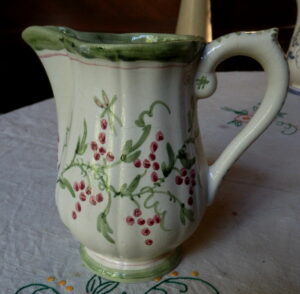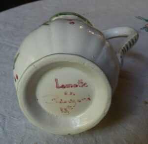 Pichet Louis XV, décor champêtre , peint « main levée » et signé RRt (Photos, non contractuelles, les commandes peuvent varier, les dessins étant à main levée) Décor sous couverte ( couleur ivoire)